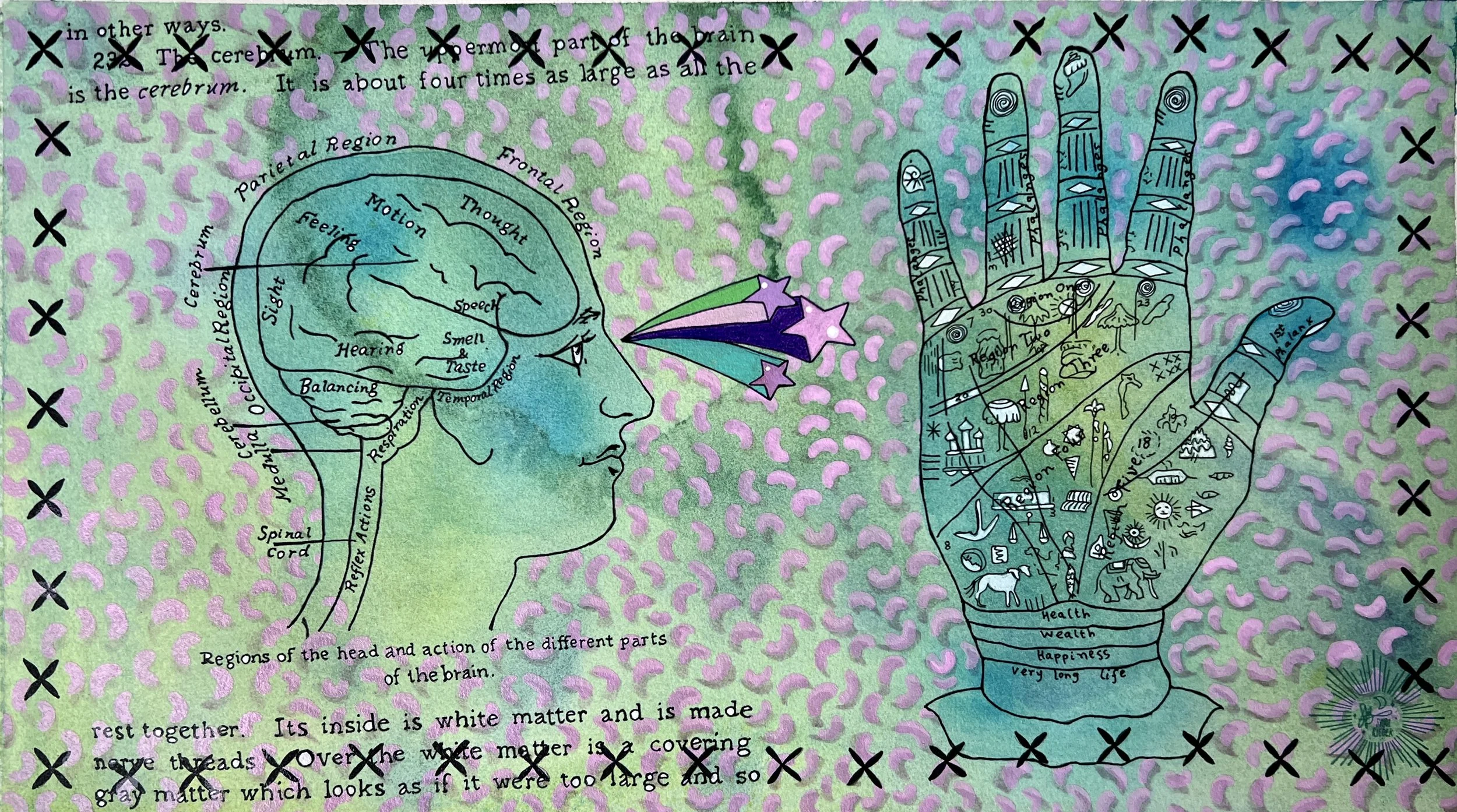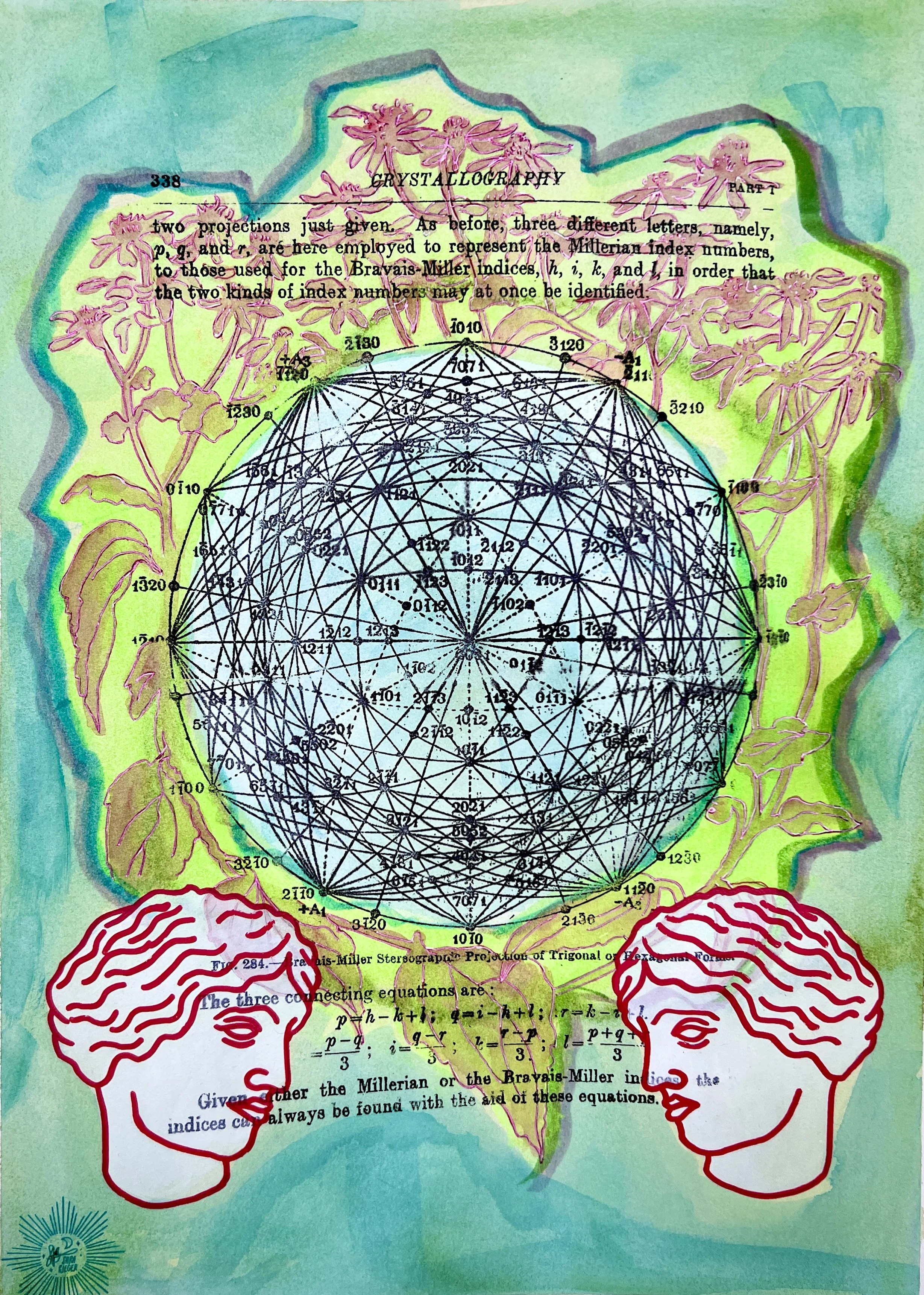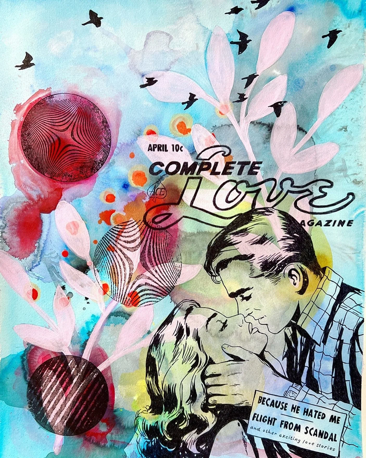 Acrylic, watercolor, transfer on wood panel.