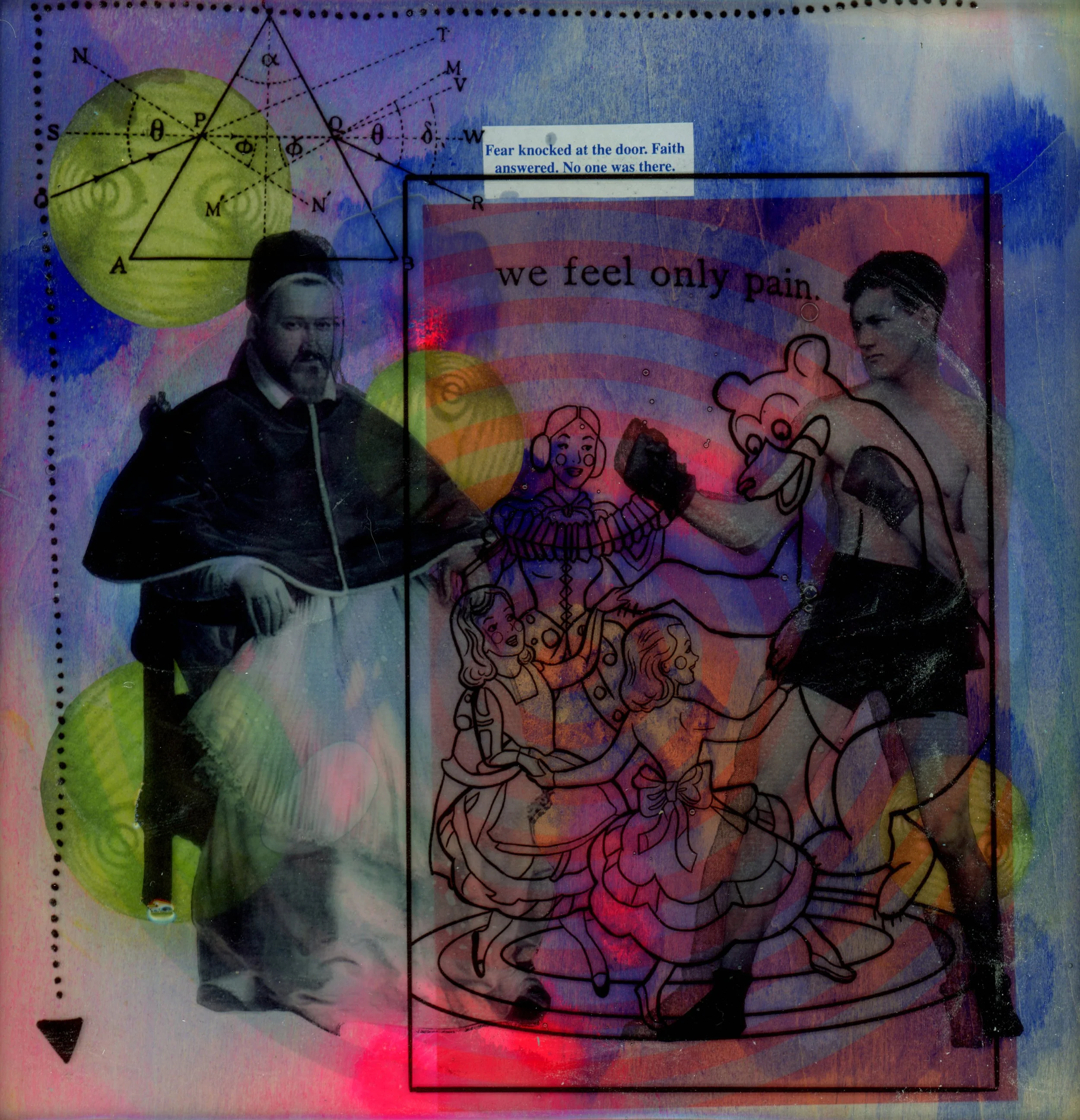 Acrylic, collage, transfer on wood panel.