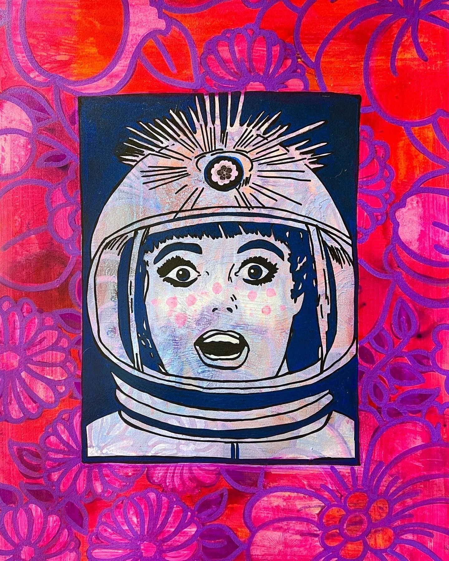 Acrylic, screen print, paper, acetate, and resin on wood. 8 x 8”